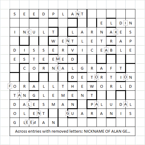 A few more sessions later, probably totalling another hour, and I had most of the top half done, including 10A WIPEOUT and 6A FAKIE – so again looks like we are in the realms of my earlier guess. I also remembered to check out the ‘omitted letters in clue order’, and started to piece together something like ‘NICKNAME OF ALAN G?LF??DUS SKATEBOARDER.