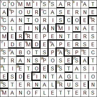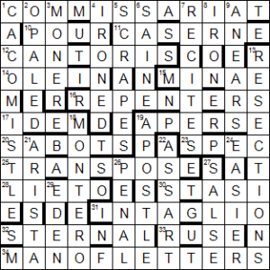 The preamble read like this: “Clues are of two types. In each of the acrosses, the cryptic part leads to the answer to be entered and the definition part leads to an anagram of that answer. In each of the downs, the definition part leads to the answer to be entered and the (cryptic) remainder leads to an anagram of that answer. All grid entries and anagrams thereof are in The Chambers Dictionary (2014), except the (two-word) anagram of the entry at 18, a proper name that may be verified on Google. Bracketed numbers refer throughout to grid entries. Anagrams of entries at 4 and 18 are each of two words. The anagrams of the entries at 28 and 34 are each of one word”.
