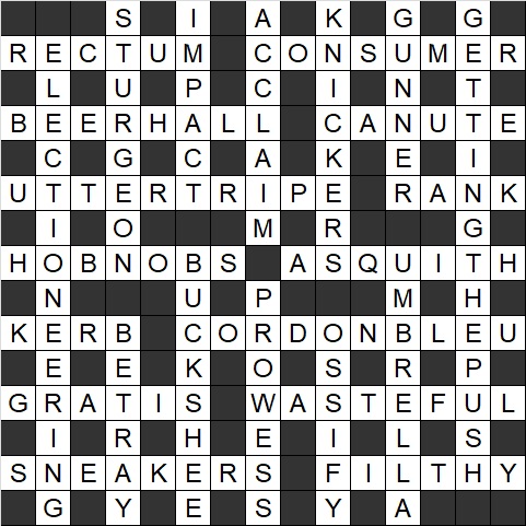 And the first clue/entry, 7A RECTUM, obviously sums up Cyclops’ feelings about politicians, and their choice of vocal organs. Followed in short order by KNICKERS, WASTEFUL FILTHY SNEAKERS, and the hope that some of them are GUNNER be GETTING THE PUSH on 12 Dec, or shortly after. Their ELECTION-ERRING promises of GRATIS BEER HALLs and HOBNOBS are UTTER TRIPE and worth BUCKSHEE, and they are all a bunch of King CANUTEs!