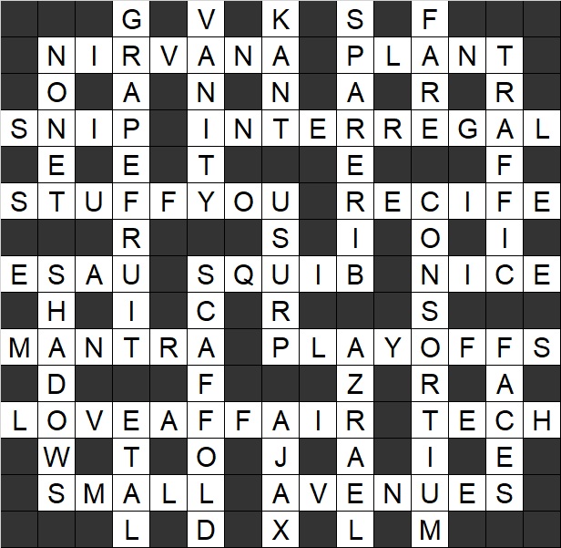 I googled various combinations of Nirvana and other solutions but drew a blank. More than one ‘pointless answer’ among that lot, I suspect. I liked GRAPEFRUIT and LOVE AFFAIR. A few more simple clues than usual, it felt like, but still tricky enough overall.