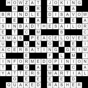 Great alphabetical puzzle which took up a couple of hours of holiday time to get done. GRIM was the first one solved but had to get another 13 clues before SINBAD THE SAILOR allowed me to start filling in the grid. After that it was a steady procession of fitting in the ones that I’d got and working out the rest. Finally finished in the NW corner with HOWZAT, ZODIAC and BRINDLE (which had to wait to check here to see that DL – decilitre was correct).