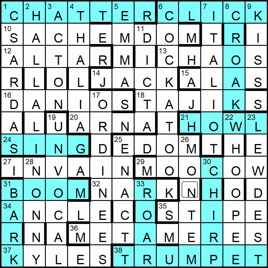 I had NARK already in for 32a when I got LION for 33d, so ROAR went straight in. Some of the other themesters proved more difficult, having to work backwards, CHATTER to MAGPIE being one of them.