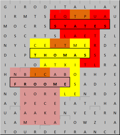 I knew I was looking for FROOME so that came easily. It looks like it’s on the back of a shirt (or jersey) and then I found THOMAS in the same relative position. This left one to find and Iwent on a mini wild goose chase looking for SYATES thinking that it was some foreign surname before realising that it was actually S YATES. It turns out that Chris Froome, Geraint Thomas and Simon Yates won Tour de France, Giro d’Italia and Vuelta España, respectively, in 2018 (which, when the puzzle was published was “last year”).