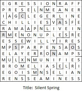The upper half was proving more stubborn, and at some point, by way of diversion, I succumbed to the offer of assistance from the “unchecked initial letters in six down entries“; reading row-by-row then left to right they spelt CARSON. So I Googled CARSON DDT …