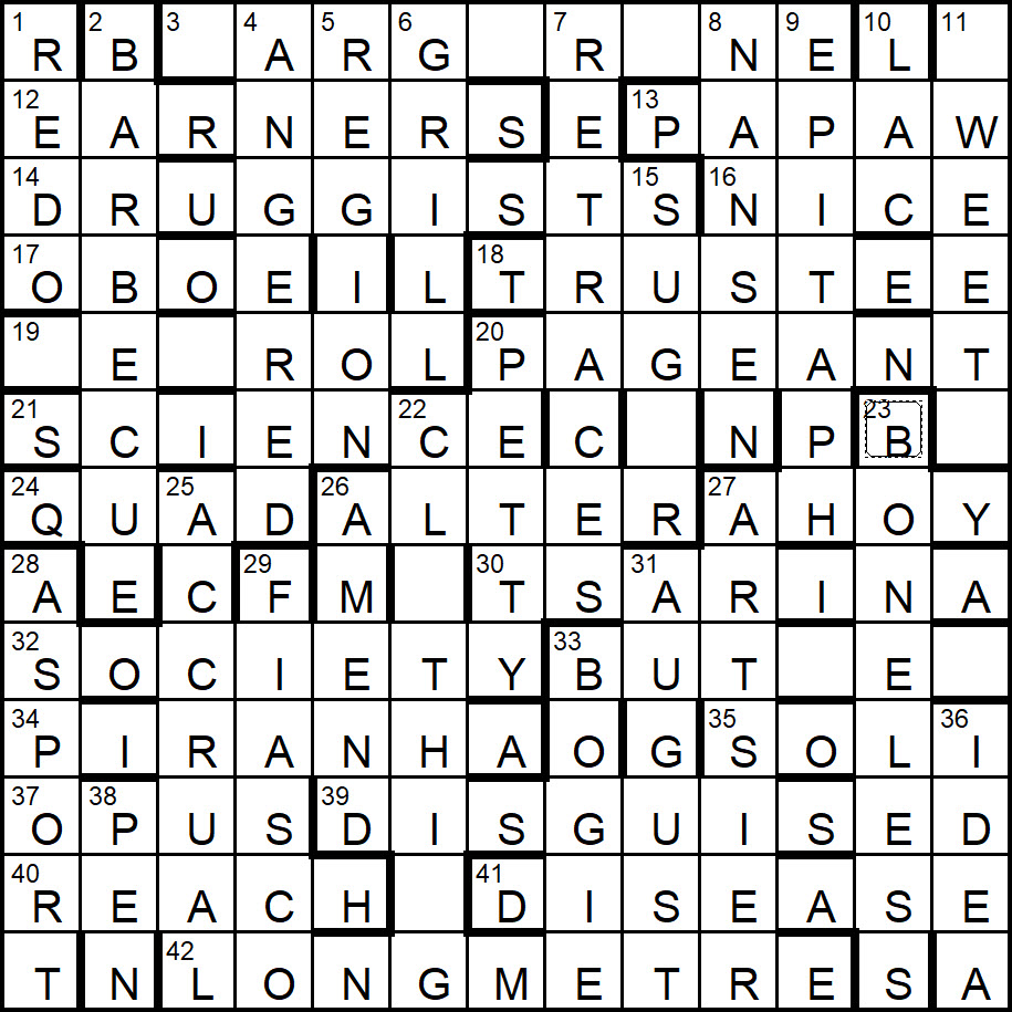 We could deduce therefore that a fair number of the across clues are normal. I started off by solving as many across clues as I could. My first entries were in the lower half with TSARINA, SOCIETY, and PIRANHA, the first of which generated one of the letters in the two-word phrase. The first shortage I solved was the one for TUBE at 33 across.. I then