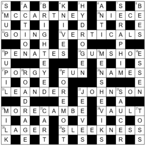 Also, a couple of answers admitted of different partners – I started putting PUTT for 27d – perhaps a more familiar partner to Pitch than Toss, BOSWELL for 22a and LEMON for 28a which also seemed valid partners.