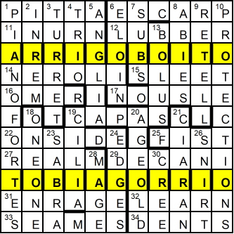 The writer is ARRIGO BOITO and his pseudonym, an anagram of this, is TOBIA GORRIO.  The names are there TRISECTING the grid and you can read more about him here.  (I don’t think TORTRICES shed any light on things!)  UPDATE: Eclipse informs us that TRISECTOR is an anagram of SCRITTORE, Italian for “writer”.  Thanks, Eclipse.