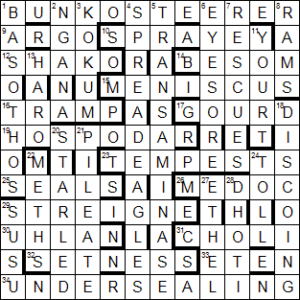 I knew the giant in 33 from Tolkien’s Ents, but took a while finding that particular spelling in Chambers (enet, ente …?). Last to parse was GOURD as I didn’t twig GO for green.