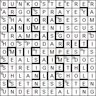 The usual combination of obscure and familiar words (including two items of Indian apparel), with the usual meticulous clueing and a helpful grid (unlike some barred cryptics, which will sometimes have a three letter word with an unchecked cell – something that Azed never does).