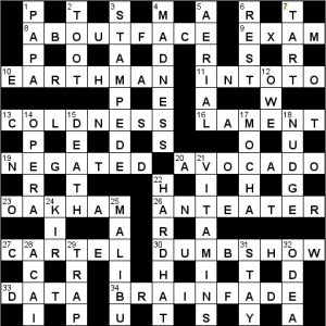 I didn’t spot the Nina until near the end of solving. (I didn’t remember to look.) But it did help get that 32D which I would have had great trouble with otherwise.