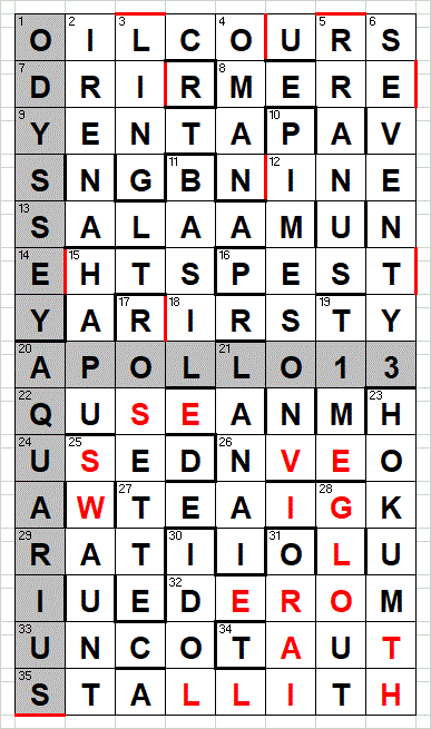 The final grid fill was still far from easy, but I eventually had the grid below, in which I have indicated the omission points in the top half by a red bar and the extra letters in the bottom half in red.