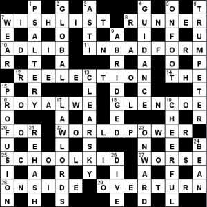| 26 | DIVE | Democrat: “One has to take a header” (4) D[emocrat] I’ve (one has) |
