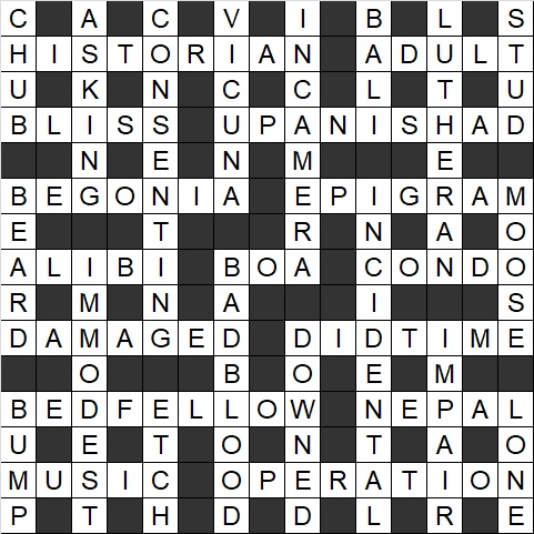 I think IMMODEST was my first in – seeing ‘Mussorgsky’ in a crossword is a real giveaway. I was pleased to be able to remember UPANISHAD from a previous appearance. Favourites were the ‘past expert’ for HISTORIAN and ‘ignorance’ is BLISS.