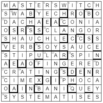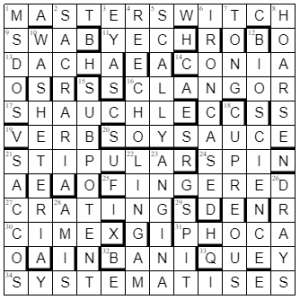 I suppose obscurity is the gimmick of these Azeds, and in part is a necessity, given their structure, but I am a little annoyed by those occasions (such as 28D) that reach for the obscure, when a perfectly ordinary definition (such as “nice friends” or “author”) or an alternate, accessible solution (such as AMPS or AMES) is available to round out an unchecked answer. Or maybe it’s just me, and other folks are well familiar with AMICE (var. AMIS) and SIMA.