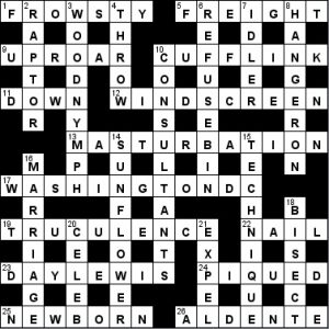 Eventually, 13A sorted out the truth of 10 with its obvious correctness and clashing “U”, but by that time I had read through all the clues and got only one more, 25a Newborn. Probably the worst “first pass” for some years.