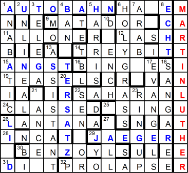 I must have been solving lots of misprinted clues lately, because several times I had to remind myself that (most) clues have an extra letter rather than a changed one. I managed to get a good foothold in the left had side of the grid and identify from the clashes the entries which needed to be changed. With enough checkers, ANGST and ERSATZ suggested themselves as synonyms of the original answers. While I had noticed that both these words were from the German, I was still silly enough to try rather hard to parse AUTOBAHN at 1a, before calling myself (in English) a doughnut, because of course this was the entry post translation.