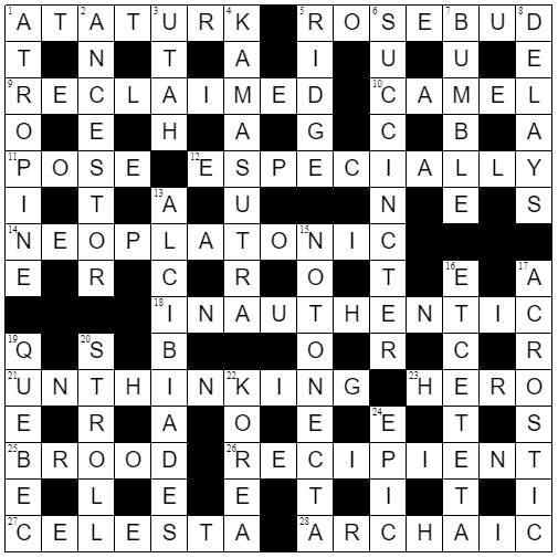 My next-to-LOI’s were NEOPLATONIC and INAUTHENTIC, both needing all the crossers I could get, and not helping myself with the latter by lazily entering UNAUTHENTIC, until I re-checked the anagram fodder.