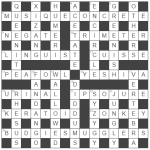 An unusual grid for a jigsaw meant that it was hard to get a foothold without solving one or both of the 15 letter clues going across. Luckily for us, MUSIQUE CONCRETE yielded on the first pass and after a few other solutions appeared, it seemed a reasonable assumption that it would be the upper one of the two long solutions. Fortunately, that proved to be correct and although BUDGIE SMUGGLER did not emerge until near the end, it didn’t hold us up too much. The other key to the jigsaw was getting the four 7 letter words in the middle of each of the four sides, added to the fact that a couple of the clues were clearly down answers.