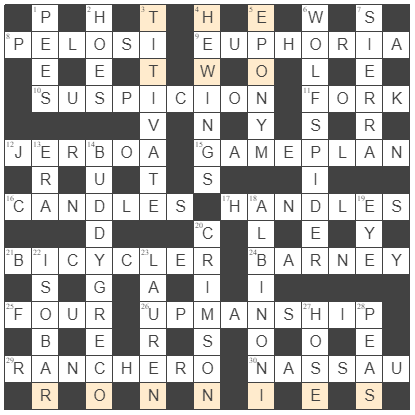 One of these days I’ll be able to complete a Monk crossword but not today. At least I got further than I did with his last one. Being ignorant of the theme doesn’t help. There was enough to enjoy, however with UPMANSHIP, NASSAU, and the simple ERA being notable. I also found PELOSI amusing despite the frightful image suggested by the clue. Thanks to both.