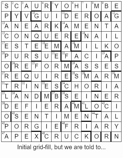 1. Kudos to Stick Insect for fitting the entirety of the poem into the grid, and the device of changing one letter per line must have been difficult to put into practice. I don’t remember how I realized the hidden words were Latin, but first I went down a couple of blind alleys because I had the wrong number of X’s in my margin. A very enjoyable workout.