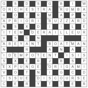 Thanks Tramp for a nice challenge with some straightforward clues, some that took a bit to get, and some that would not drop. I didn’t know 1d (great surface) and IDEMPOTENT and I just couldn’t figure out DETOX and TRENDY, both very cleverly clued. Favourites included ISIS, ORIGAMI, SCORCESE, and GAMBIA. Thanks PeeDee for the write-up and active participation in the comments.