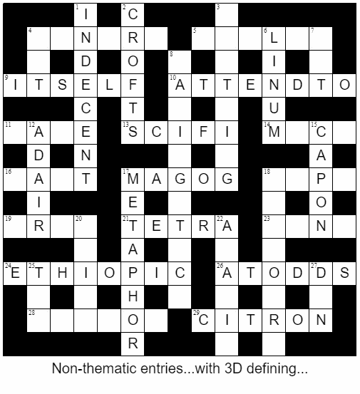 Going back to Red ADAIR, around the same time as this I was also solving Puck’s April 3D puzzle, from the excellent 3D Crossword Calendar project, which also features ADAIR – clued very differently, but whichever one I solved first meant it was in recent memory for the other,