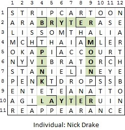 It’s pretty much impossible for me to comment on issues of fairness/unfairness as regards this particular theme, but I guess it would be interesting to know if any members of the editorial team hadn’t previously heard of Nick Drake and therefore had to work it out from the puzzle itself. If they were all aware of him, then maybe there was some unwitting bias and certain aspects of unfairness/ambiguity were overlooked. As a solver for the other 51 Saturdays of the year, I fully appreciate the frustrations of not being able to crack an endgame though, so apologies to those who didn’t manage to nail this one or found it a bit of a grind.