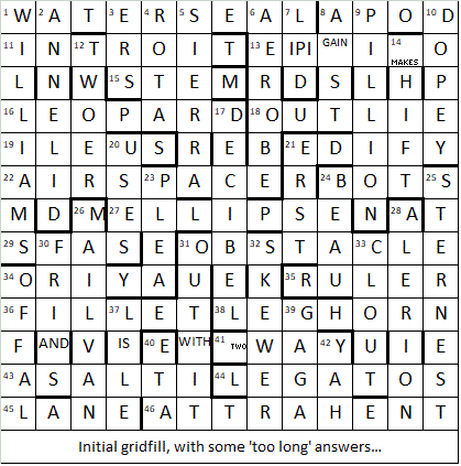 And so it proved – it soon became clear there was something going on in the top right corner, with LIPID, AGAINST and MAKESHIFT all too long for their slots. So, LIPID could be LIP-ID, L-IPI-D or LI-PID, etc. Years of EV experience suggested that there might be another batch of similar activity in the bottom left – given our setters’ devotion to symmetry! – and I wasn’t wrong here – although this took a while longer to eke out. LISLE and TWO-WAY were initial candidates down there – with TWO-WAY likely to become 2-WAY, and the third row up looking likely to be the location.
