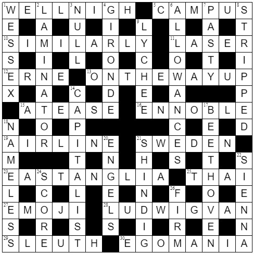 There are a few real nouns/some general knowledge in the solutions – with WESSEX, EAST ANGLIA, the GIRONDE and SWEDEN on the geography front, and LUDVWIG VAN BEETHOVEN (great anagram!) and ENGELS on the historical person front – but none of these is particularly obscure, and they are all gettable from wordplay/crossers.