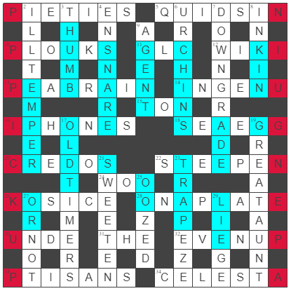 Solving this puzzle was a rewarding experience, and I consider it to be a masterpiece for its design, its clues and the gridfill. After completion I managed to clear up my two outstanding issues: the parsing of OLD-TIMERS (featuring the DO-RE-MI sequence) and PEA-BRAIN (with MARIA).