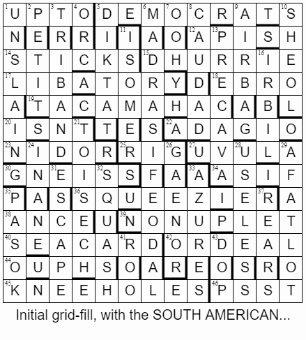 Things took a while to clarify, but my first PDM was seeing ‘FALLS’ as extra letters, from 39A to 45A. And, as any fule nose, the most famous falls in South America are Angel Falls, so we will probably be looking for ANGEL somewhere in the grid later. Next up was ‘MOUNTAIN, from 1D, and a bit of e-research told me that the highest mountain on the continent is Aconcagua – which seemed to tally with some Gs, Us and As around the middle/right-hand side. I was on a roll!