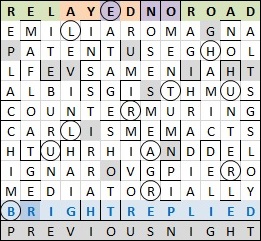 It was now time to tackle the endgame. The penultimate row, BRIGHT REPLIED is “on the” PREVIOUS NIGHT, so that cryptically indicates the final line of the limerick. Two more lines to find, and it really has to be the third and fourth. The top row begins REL and ends ROAD so that indicates “in a relative way”. At this point I stumbled because I’d lazily used Wikipedia, which has line 3 as “She started one day”. I went out for a short pre-lunch walk with the lines as I remembered them running through my head, and something wasn’t quite right. When I got home I checked my ODQ, and my memory had served me well: the line is “She set out one day”, and so we see ONE DAY “set out” in the middle of the top row, which now cryptically represents the required two lines.