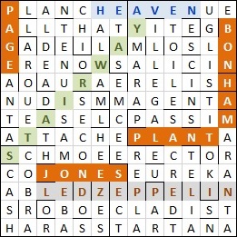 The Z of 31d HEEZES was the last letter I entered, and as soon as I wrote it in my eyes drifted left & right … and there was LED ZEPPELIN. (I recall having seen them in the late 60’s when I was still at school, in the sixth form – before they were really famous.) Upward to the top of the grid and there’s HEAVEN. How do we get there? Using a STAIRWAY of course. Now that’s only 25 letters, so another 20 to highlight. Robert PLANT and Jimmy PAGE I know but I had to Google the others: John BONHAM and John Paul JONES.