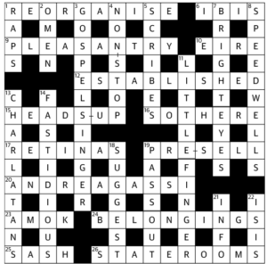 An enjoyable solve, if over rather quickly. By coincidence OMEN clued as a reversal of (Captain) Nemo was in the Indy crossword las Monday. Setters’ minds do tend to think alike at times.