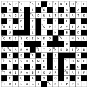 13. Thanks Pierre and Anto. Another who didn’t twig SWARM here. Loved “Imagine writer” for THE FAB FOUR – very neat. Agree with Andy @7 and others on TAKE OFF being a triple.