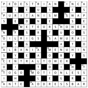 Thanks for the blog, Pierre. And thanks Everyman for another entertaining crossword. I do enjoy the trademark “primarily” clues and SAMURAI is no exception.