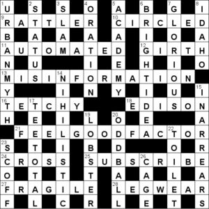 5. Little bits of indirectness in anagram fodder like that in 13ac, MISINFORMATION don’t bother me as they do Roz … but we’ve discussed all that before.