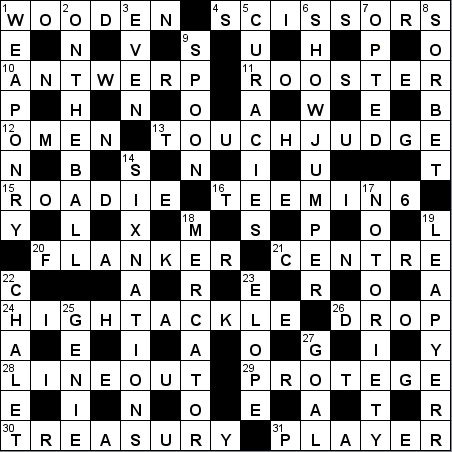 I could tick virtually anything and everything but that wouldn’t do so I’ll nominate WOODEN SPOON for its assembly of parts, SIX NATIONS for its smoothness, ROOSTER and FLANKER for the witty surfaces and ON THE BALL for the originality. Two thoughts – these days the LINEOUT is more of a lifting than a jumping competition – and it would have worked just as well as a surface. And I wonder if the ? in the clue for DROP GOAL is because a penalty goal is also worth 3 points?