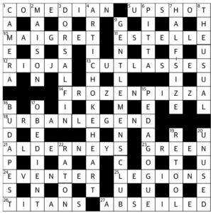 As Robi says, inconsistency is the word when it comes to Everyman puzzles. What will be supplied to us next week? Who knows. As for this week I thought nearly all the clues were error-free, and 10 & 23 across were really good. I didn’t really like FROZEN PIZZA as an entry, as opposed to entree if we are doing puns, or buns, and I’m fairly sure it isn’t really a pie, at least not in UK-speak. 21 across is effectively an anagram of an obscure word, so I didn’t go much on that, and 26 across is the clue that kind of has to be there as it’s ‘what Everyman does’. These days.