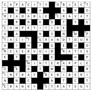 I was slowed down by putting in PLANE instead of CRANE for 3dn. The inclined plane is one of the classic “simple machines” that provide mechanical advantage to lift weights. I did think that using “machine to lift weights” to clue just PLANE rather than INCLINED PLANE seemed a bit unfair, but I wrongly convicted Chandler of this sin and went on until CAPACITY made my error clear.