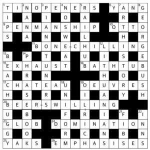 For once the pair helped the solve. Got BEER-SWILLING first, but stuck on the parse for BONE-CHILLING.