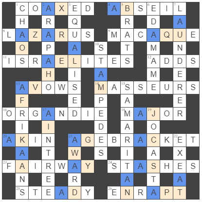 Expecting special instructions I was a bit disappointed and when I couldn’t solve CHAOS, LAZARUS, ORGANDIE, JOCASTA, AINTREE, or ABSEIL I decided that this crossword was not my cup of tea. Thanks to both.