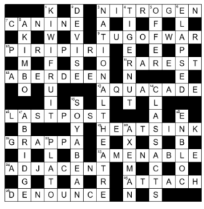 Kairos is most often seen in the Independent on Sunday crossword slot, and I always enjoy his puzzles here. This one took a bit of finishing off, and there were one or two parsings that eluded me for a while. But I think I have it all nailed down below, and am interested to see what others made of it.
