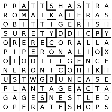 As usual my approach was to group clues with the same answer length together, which reduces some of the confusion. As usual, there are six clues of each of six lengths, the only unusual constraint on the grid. Also as usual, it took a fair bit of cold-solving before the crossing letters were of much use, after which things became slightly easier, though by no means a walkover. There seem to be a lot of clues of the form (anagram less something), and there are a couple of cases where the same word is used for both definitions of an answer: “fruit” for GAGES and “drug” for DOWNER, which seems a bit of a blemish, though no doubt hard to avoid completely.