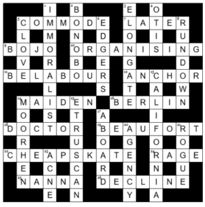 Thanks Hoskins for the Sunday amusement. My favourites were COMMODE, CHEAPSKATE, BERLIN, and BEAUFORT (for a moment I thought the answer might be “bean fart” from the crosses but that would not parse). No problem with the potty references from this side of the pond obviously. Thanks Pierre for the blog.