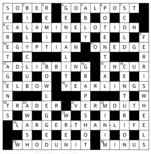 This was a sub-20 minute solve for me – yes, I did know what a TIAN is, it’s also the name of the dish that you cook the recipe in – so I am with those that think that it’s suitable Quiptic level. I didn’t start writing them in until CALAMINE LOTION, my FOI, but a lot of the clues were write ins. I think my last in was SCOLD.
