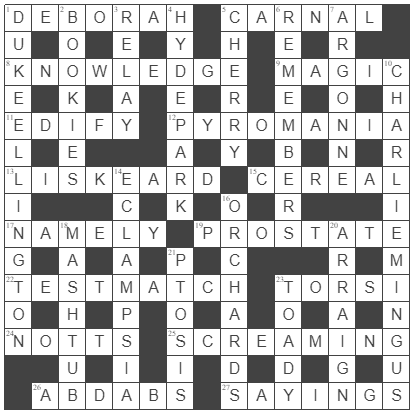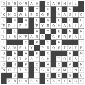 Thanks Chalmie for the enjoyable challenge. I missed NOTTS and BOOKIES and needed a look-up for SCREAMING AB-DABS (great sounding expression, I’ll have to research it). I couldn’t parse EDIFY or ECLAMPSIA — thanks PeeDee for the help. Now that my failures are out of the way I must say this was one of the better crosswords lately — CARNAL KNOWLEDGE, CHERRY, PYROMANIA, CEREAL, PROSTATE, and NAMELY were all top notch in my book.