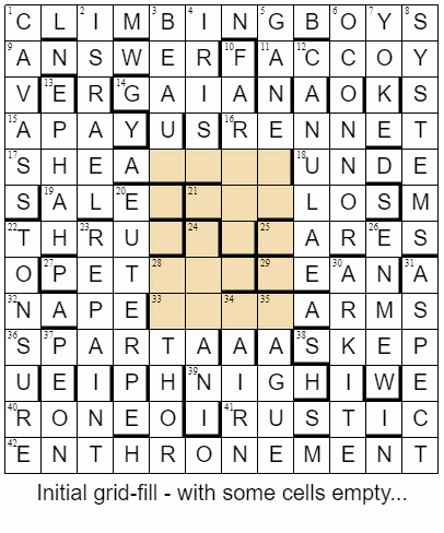 And so it turned out…I made some reasonable progress with solving, and it soon became clear that the empty cells were going to be concentrated around the middle of the grid – SHEA, ALE, THRU, ARES, BEAU and IRIS all too short for the enumerations, and coming up just short of (or after) the centre.