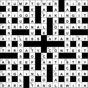 | 1 | TRUMP TOWER | Top puller reveals bad loser’s vainglorious erection (5,5) TRUMP (top, i.e. surpass in card game sense) TOWER (puller) |
