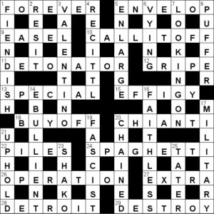 I should have been in some sort of competition solving this one. I rattled through the most of the puzzle without a pause in a very short time, till I got to the long answer at 13/17/26. I knew there was a three word euphemistic phrase the Russian Gov. is using for its illegal invasion but I could not bring it to mind with just the leading S to help. When crossing letters revealed what the second word had to be I remembered in plainly, but by that time there were only a half-dozen left to solve. I found the trickiest clue was 24 SPAGHETTI. I became convinced the def. was “pet food”, some brand like “Dreamies” that I don’t know, and that “A lot of money” was 5 letters (e.g. GRAND) inside an anagram of SHIT. thus even with all crossing letters I stared at it hard before kicking self around the room when I saw what it was. The final pair were 6D VYING & 12A GRIPE. A couple of the best clues in the puzzle I thought – I ‘m nominating 6D for the top clue award.